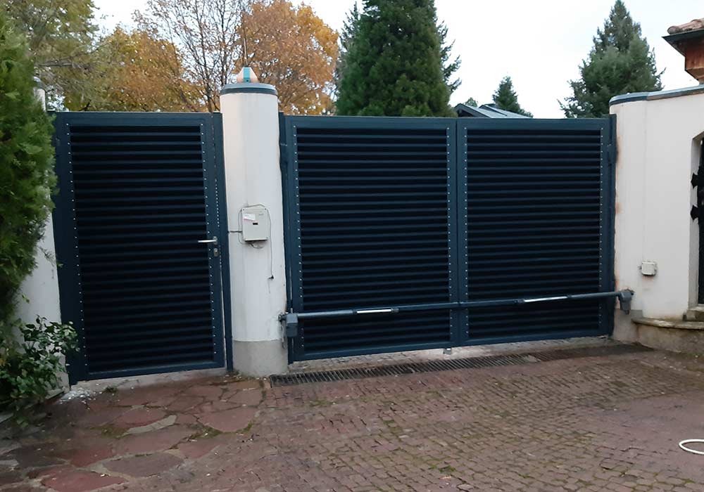 Двукрила гаражна врата от горещопоцинковани ламели RAL 7016 дължина 4 м. /височина 2 м. с механизъм за дистанционно отваряне.